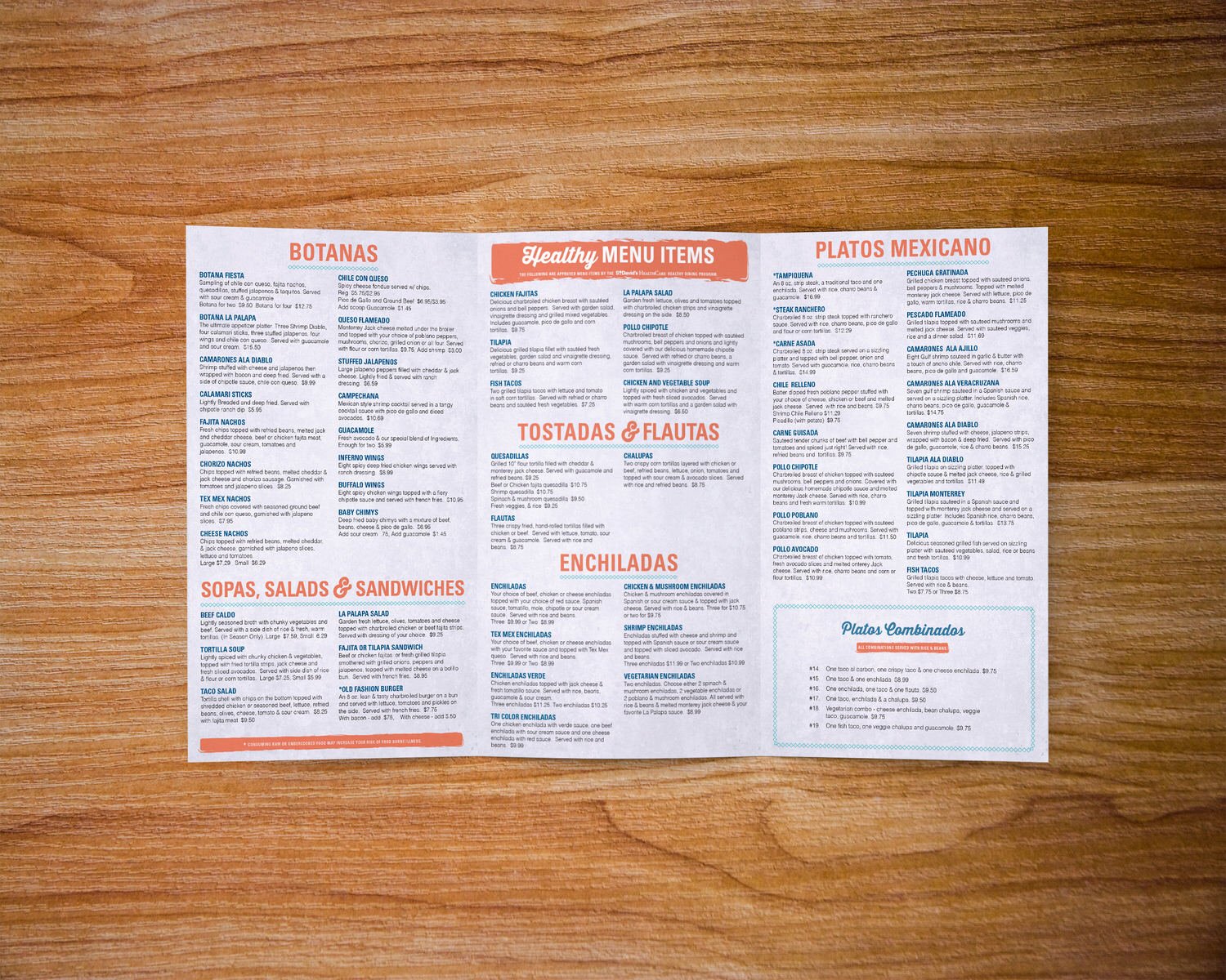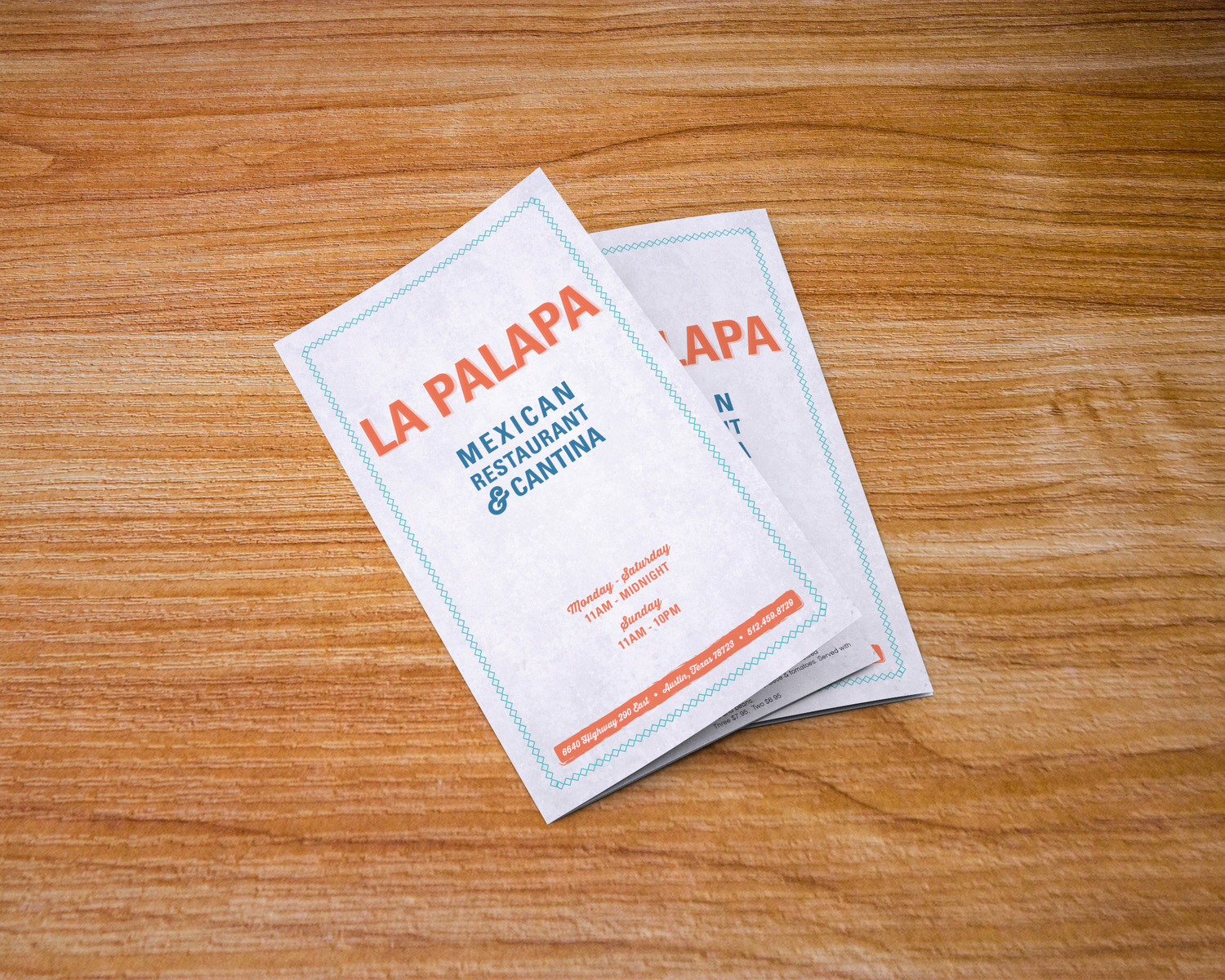Menu design for La Palapa Mexican restaurant and cantina, an Austin based Mexican food restaurant.